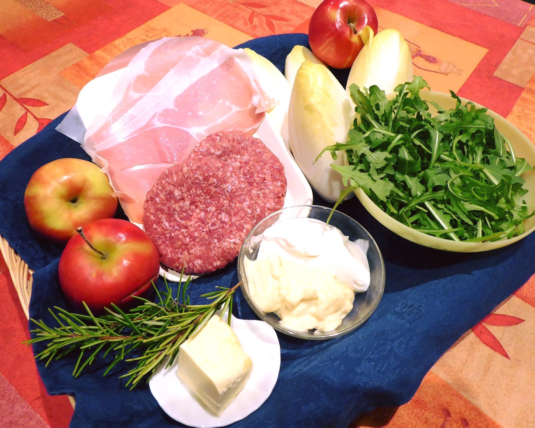Ingrediënten : 2 hamburgers, 2 sneden rauwe ham, 2 appelen, rozemarijn, peper, zout, klontje boter.