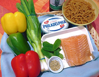 Ingrediënten 2 pers: 350 gr zalm, 1 groene, 1 gele en 1 rode paprika, 1 bos lente-ui, 200 gr roomkaas, 4 à 5 blaadjes salie, 1 dl witte wijn, 3 dl kookvocht, peper, zout, 180 gr spirelli, olijfolie.